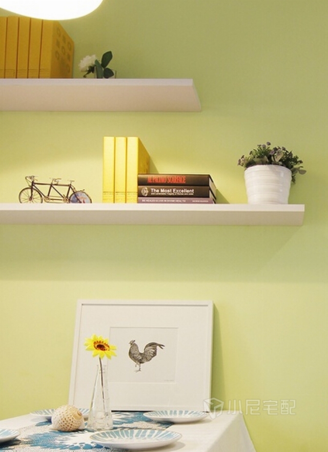 餐廳背景墻使用健康的黃綠色,整個(gè)空間明亮簡(jiǎn)潔。