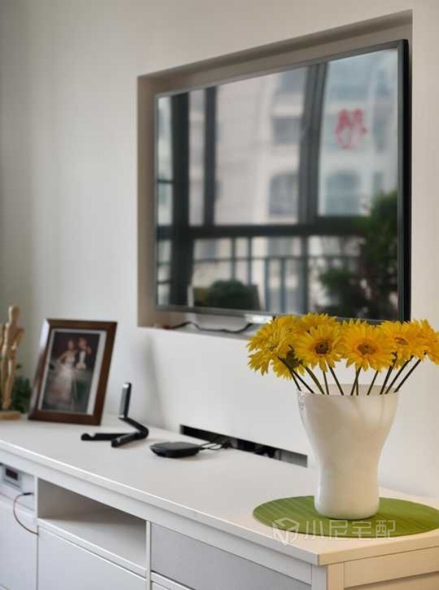 電視墻采用歐松板飾面,白色實色漆啞光,電視內(nèi)嵌處理。與購置的宜家成品電視柜搭配完美。