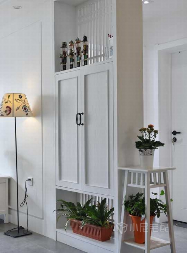 隔斷柜上下半通透處理,滿足過道的采光通風(fēng),中間帶柜門的部分滿足了客廳的儲物功能,同時合理的規(guī)避了衛(wèi)生間門對著客廳的尷尬。