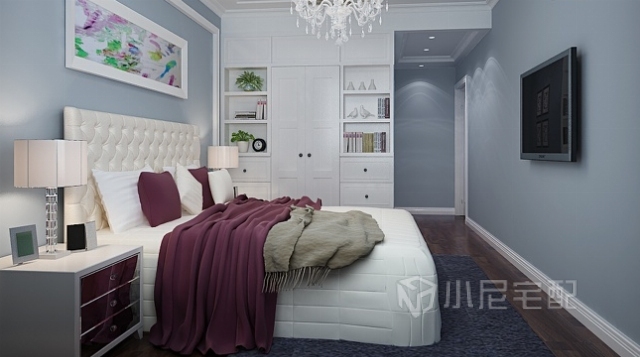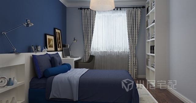 藍色壁紙白色烤漆衣柜配以紅色點綴使整個空間充滿無限活力。