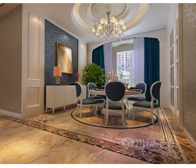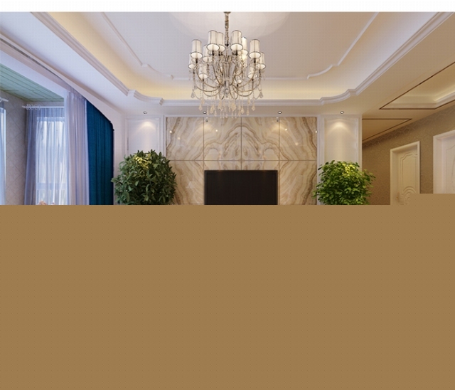 客廳藍色窗簾和水晶燈的搭配讓整體色調清爽一些。