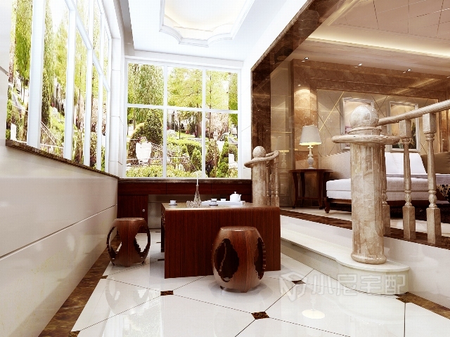 休閑處還是以紅木的效果搭配冰冷的石材,凸顯雅興。