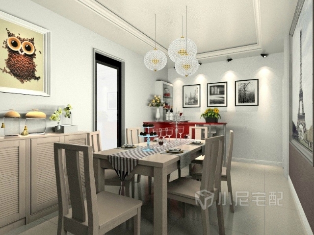 餐桌椅和餐邊柜與墻上的裝飾畫合理搭配,簡潔大方,簡單的產(chǎn)品布置完整的表達了餐廳的功能。