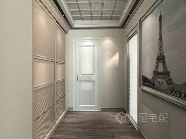主臥進門處,不大的空間用雙扇移門衣柜,小空間大利用,墻上的那座埃菲爾鐵搭,吾愛。