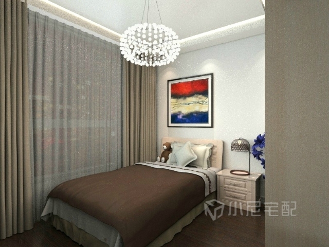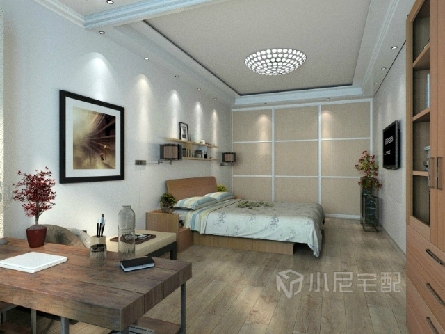 另一個視角看次臥室,吊頂將其一分為二,劃分出來一個獨立的辦公休閑區(qū)。