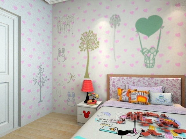 粉色心形墻紙給人一種清新可愛的效果,墻上的印畫將兒童房的浪漫氣氛烘托的淋漓盡致。