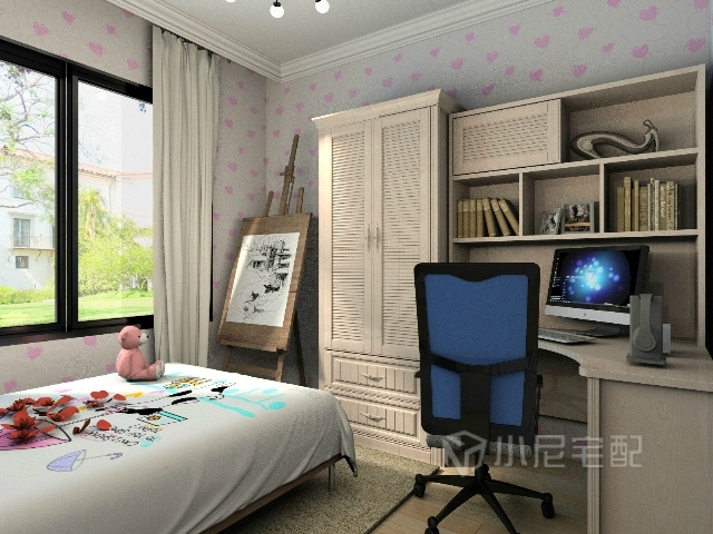 陽光從窗戶照射進來特別溫暖,屋里即可畫畫又可讀書查資料,衣柜下的抽屜可以放些自己喜愛的小東西,書桌可以讓孩子舒適的學(xué)習(xí),真所謂麻雀雖小五臟俱全。