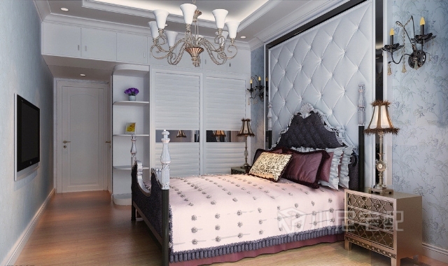簡約的造型處理臥室門與電視墻的關系,玻璃鏡面增加空間感與時尚感。木門為天安木門德佳系列。