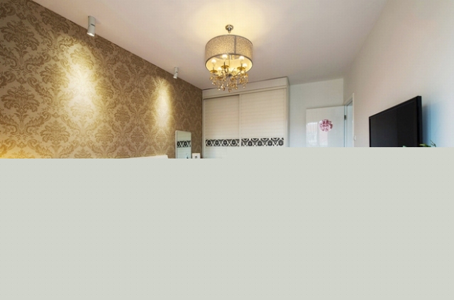主臥的家具選擇統(tǒng)一的白色,金色壁紙,搭配粉色的床上用品。