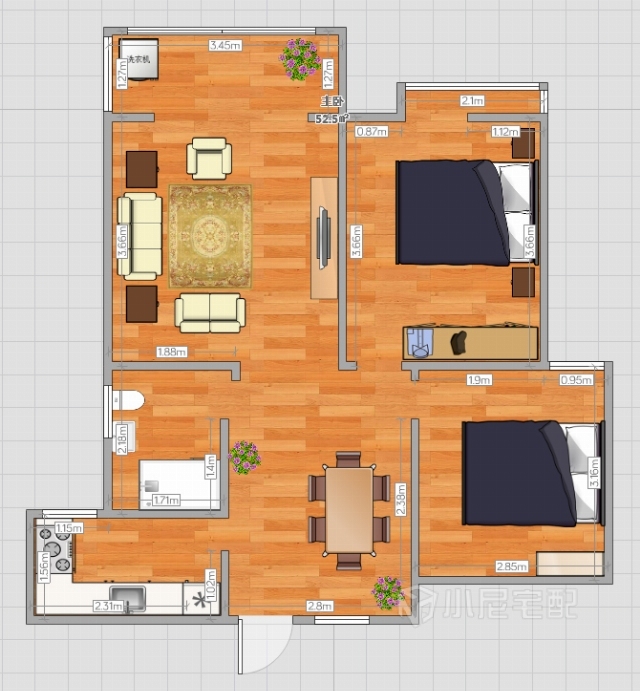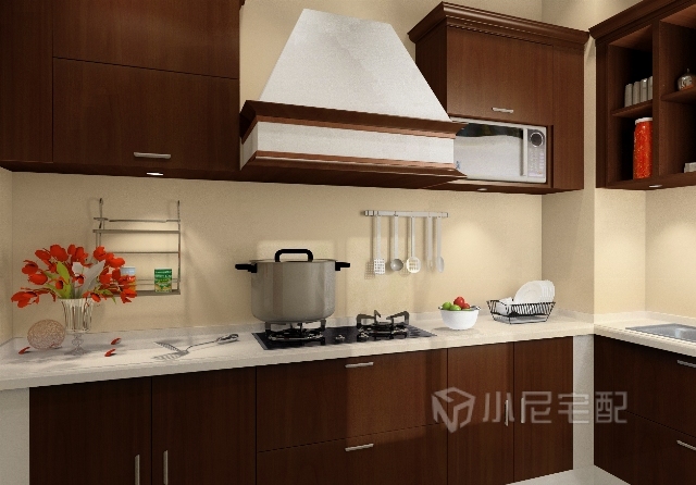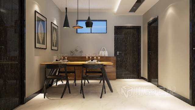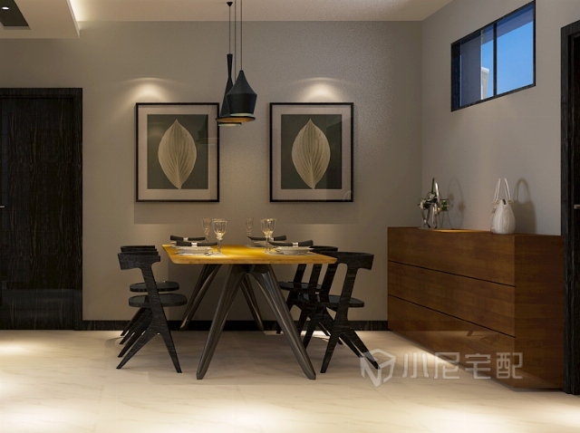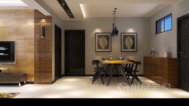 餐邊柜繼續(xù)保持木色和對(duì)稱(chēng)和整體風(fēng)格一致,而稍富有變化的餐桌和時(shí)尚的吊燈給人稍歡快的感覺(jué)。