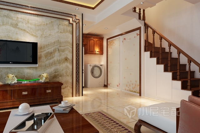 客廳電視墻的效果圖展示,木料加石材顯得沉穩(wěn)大氣