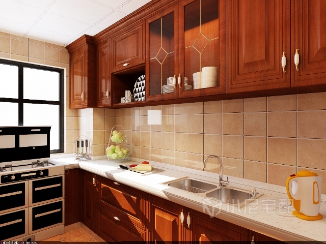 展現(xiàn)的是一個廚房的大角度,吊柜做了半開放式搭了兩扇玻璃門起到畫龍點睛的作用是整個廚房更加有風格。