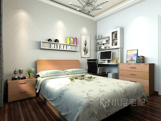 主臥的基調(diào)是樸實,不管是吊頂,還是原木色的大床,都帶著簡明的顏色和線條。