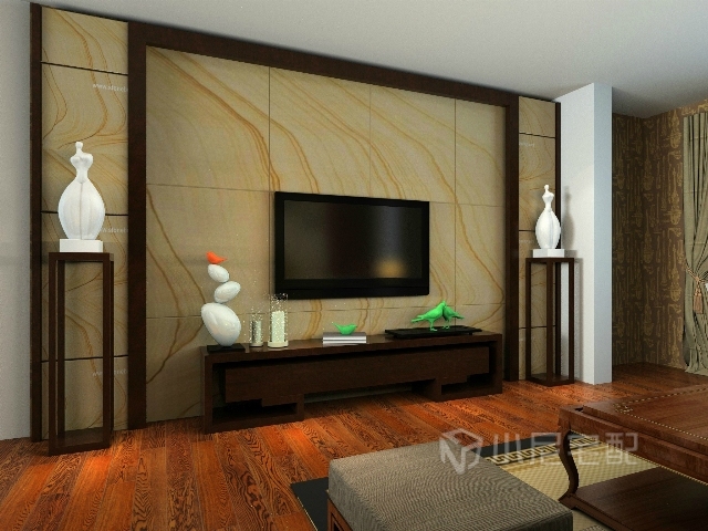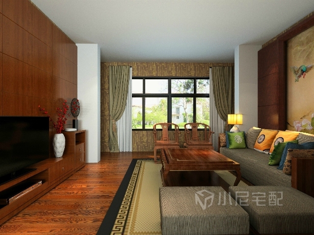 中式古典的電視背景墻,搭配深木色的地板,更顯莊重,尊貴。