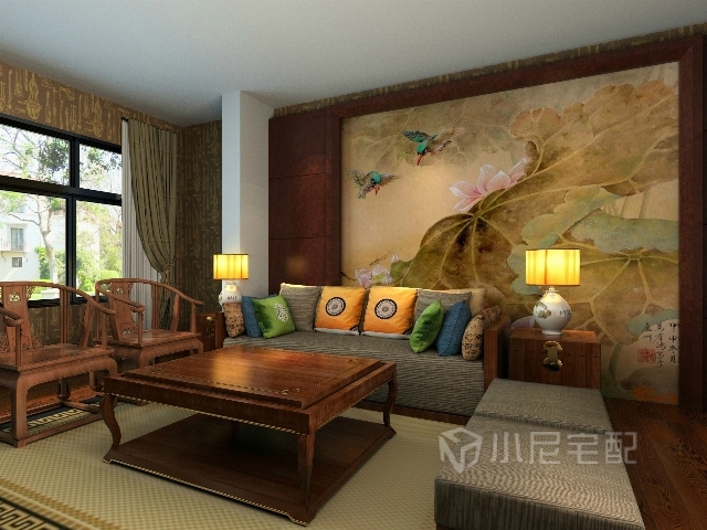 中式古典的茶幾和山水畫的沙發(fā)背景墻也顯示出尊貴、奢華。