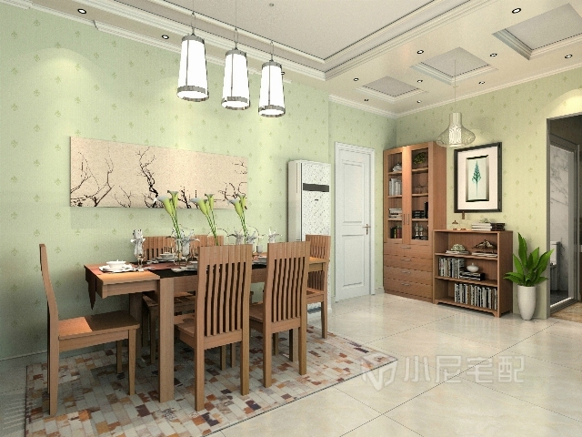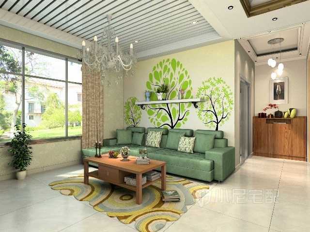 電視背景墻的一抹綠色墻紙給整個(gè)不大的空間帶來了生機(jī)。