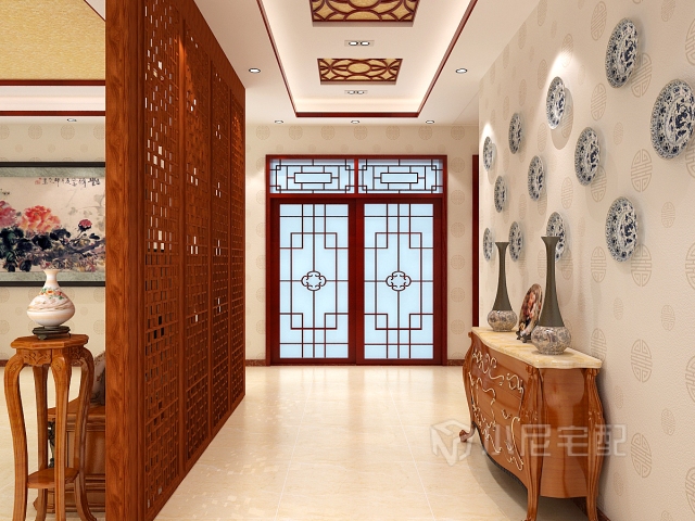 走道造型墻青花瓷盤的裝飾體現(xiàn)中式的厚重感覺