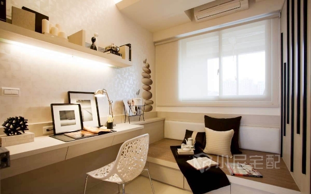 書房兼客房,榻榻米的神奇用途,利用隔板作為書架,既節(jié)省空間又極具收納功能。