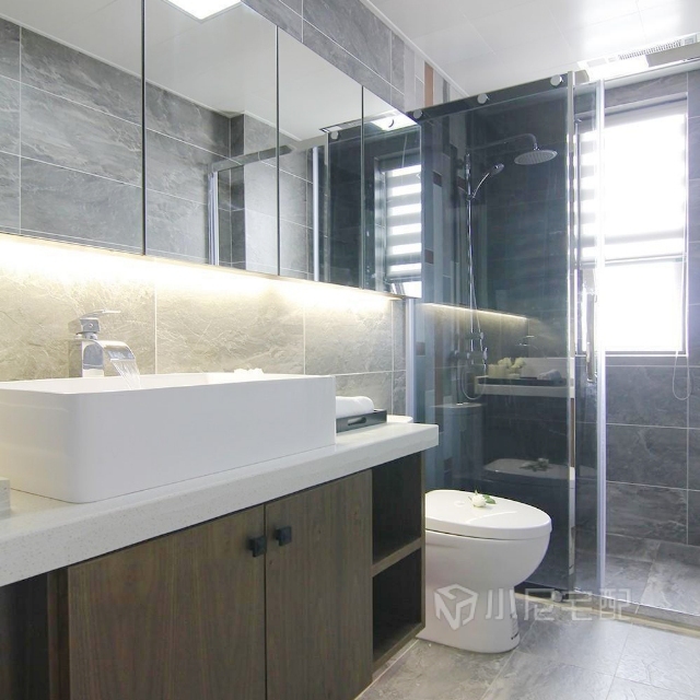 原本瘦長形的衛(wèi)生間,大面鏡柜讓空間視野有延伸感,深灰色墻磚顯得冷靜,磚面紋理讓人有在石灘行走的感覺。