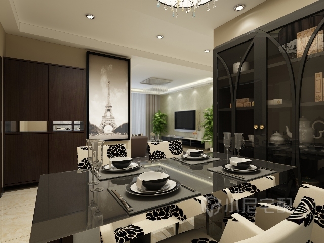 鏡面的餐桌和玻璃酒柜,高格調(diào)的就餐環(huán)境輕松彰顯,整體顏色與客廳相互配合,渾然一體。