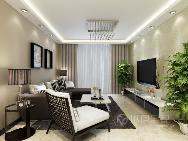 簡單的吊頂與飾面,使客廳看起來并不繁瑣,深淺搭配使整個(gè)空間看起來干凈整潔。配上綠植的明亮色彩,讓客廳少了一絲刻板,多了一份靈動。