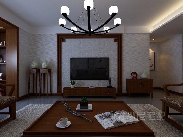 木框的電視墻與木個的電視柜,還有木色的邊幾,張顯了電視墻的高檔。
