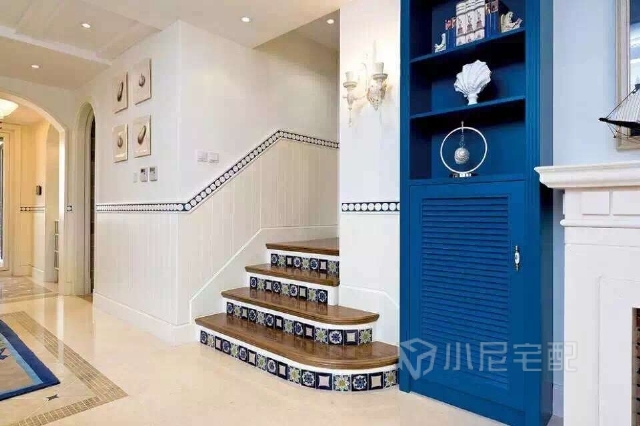 每個(gè)臺(tái)階上都有藍(lán)色拼花做裝飾,精致漂亮。