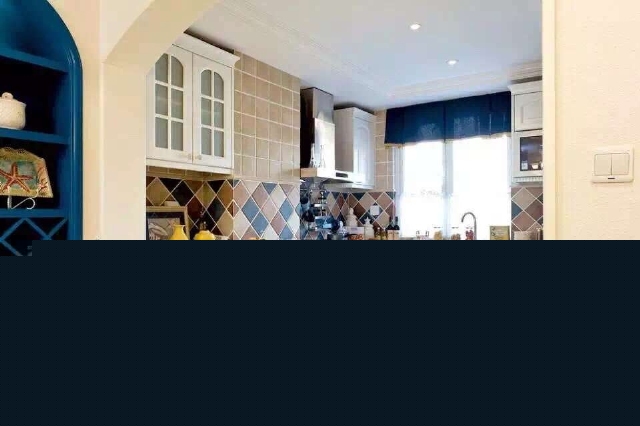 開放式的廚房,彩色的墻磚使整個(gè)空間充滿活力,更于符合整體氛圍。