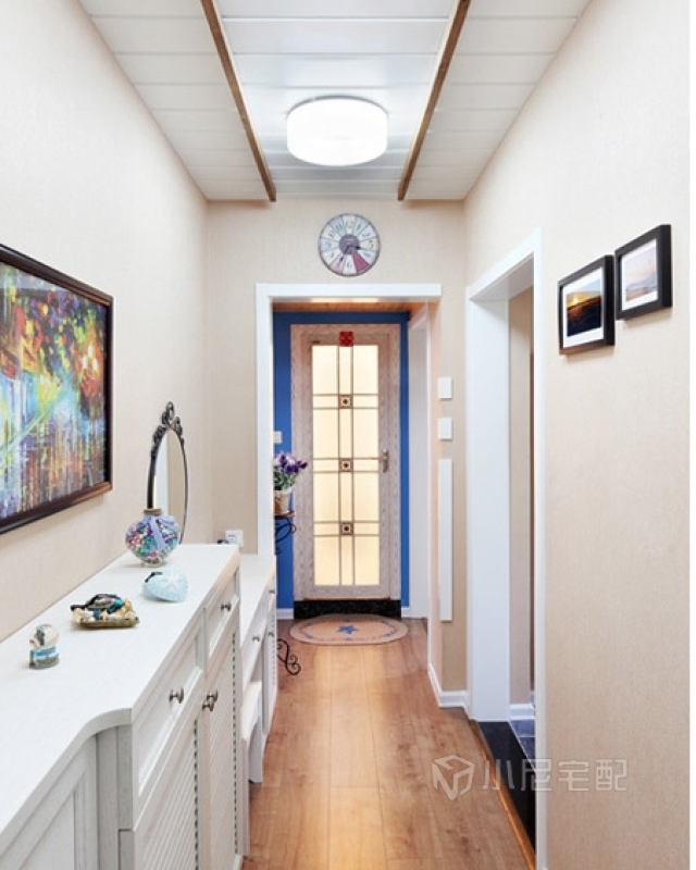 狹長(zhǎng)的走廊用來(lái)放置儲(chǔ)物柜和梳妝臺(tái),無(wú)處不在的裝飾畫(huà)成為家中的一道道靚麗風(fēng)景。