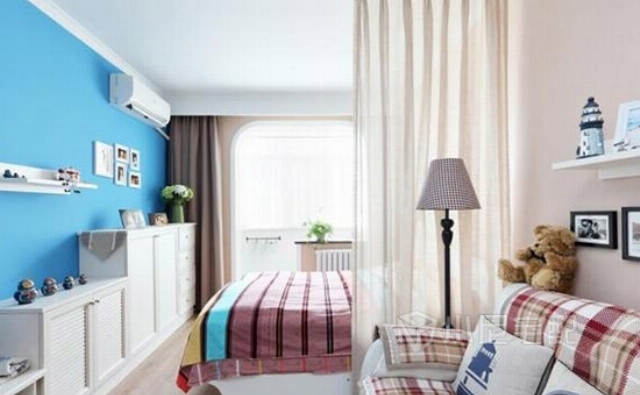 客廳與臥室只用了一扇紗簾來(lái)隔開(kāi),軟隔斷在保證隱私的前提下,也讓空間具有更好的連通性。粉刷了藍(lán)色墻漆的墻面顯得活潑溫雅,一排連續(xù)的儲(chǔ)物柜讓收納有了足夠的空間。