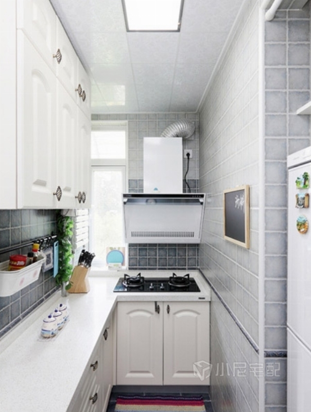 廚房不大,而白色的櫥柜能讓空間顯得更加明亮,似乎在視覺(jué)的感受上寬敞了不少。對(duì)于油煙重的廚房來(lái)說(shuō),鋪貼瓷磚相對(duì)來(lái)說(shuō)更易清理,地上鋪一塊小地毯,也能有效防滑。從收納的角度來(lái)講,寬敞的臺(tái)面、充足的收納柜加上有效的立面收納,小小廚房也可以有強(qiáng)大的收納功能。