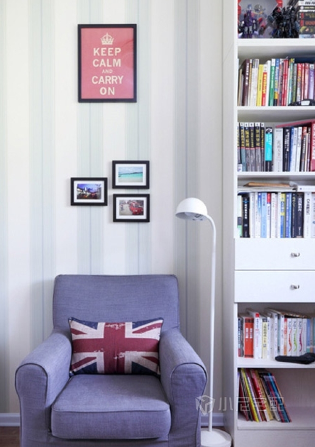 可愛(ài)的單人沙發(fā)上,有一個(gè)英倫味兒十足的小抱枕,墻上的裝飾畫(huà)別有趣味。小小的落地?zé)艚o蜷縮在沙發(fā)中慵懶閱讀的時(shí)光帶來(lái)了光亮。