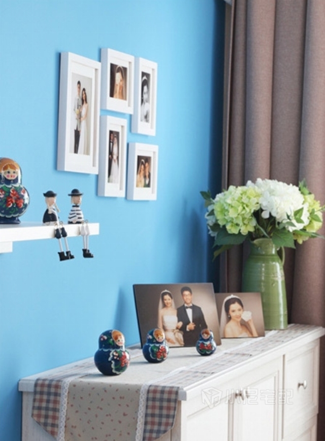 臥室里的一角。儲(chǔ)物柜上鋪了一塊小清新風(fēng)格的桌旗,既防塵又美觀。桌面上的相框以及照片墻,無(wú)不體現(xiàn)著夫妻二人的感情甜蜜。