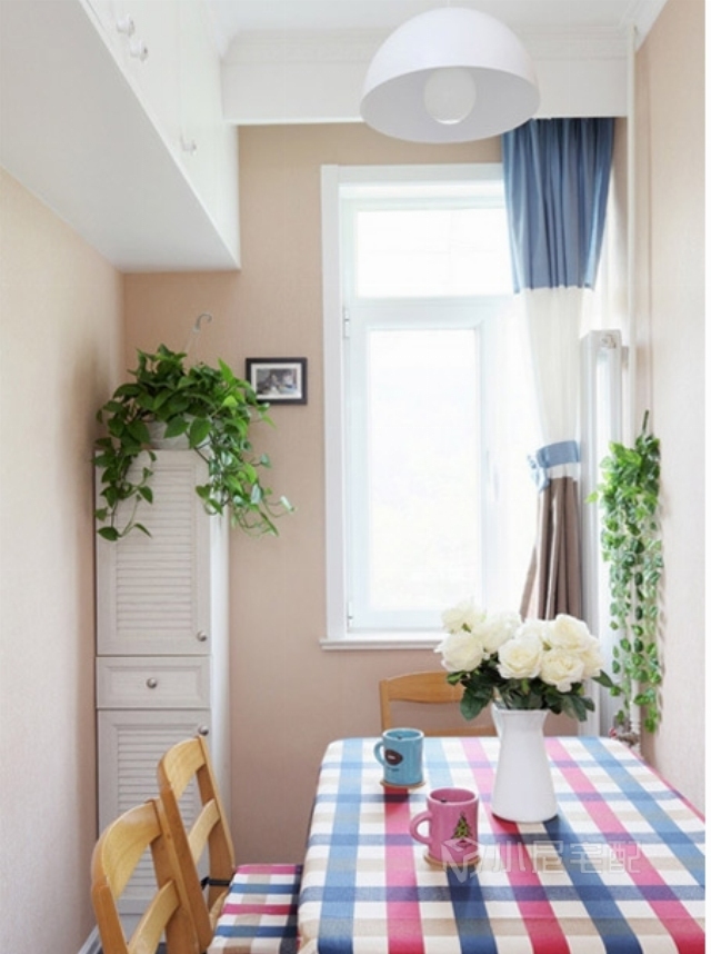 餐桌上的格子桌布帶著濃濃的英倫氣息,一藍(lán)一紅兩個(gè)小杯子剛好是情侶款,小房間里溫情滿滿。綠色植物的點(diǎn)綴恰到好處,讓空間瞬間清新起來(lái)。
