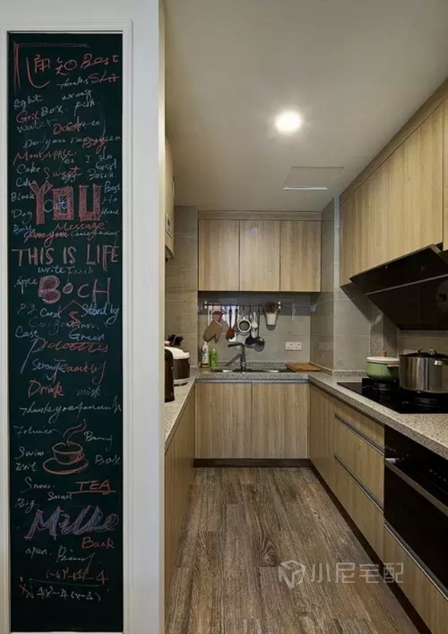 這塊小黑板是特別貼心的一個(gè)設(shè)計(jì)。現(xiàn)在二人世界,甜言蜜語(yǔ)。將來(lái)有了寶寶,也有了涂鴉的地方。L型廚柜利用轉(zhuǎn)角,能夠盡量利用中間地帶的操作空間,給廚房的生活增添很多樂(lè)趣。