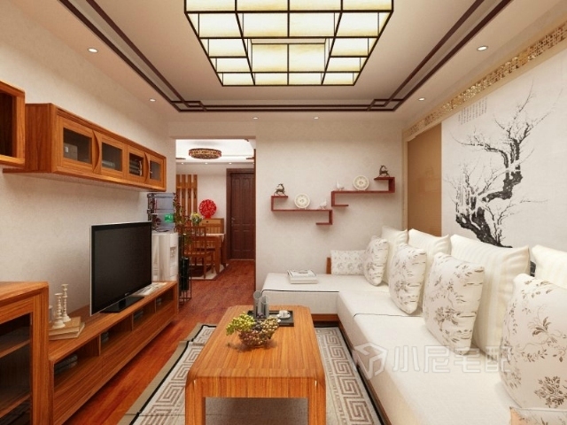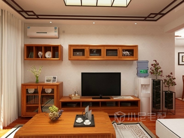 客廳:以木質(zhì)家居為主,但不是復(fù)古式的桌椅,而是富有現(xiàn)代感的沙發(fā)和茶幾。除了保留中式的韻味外,還加了玻璃、燈帶等現(xiàn)代材料,使空間又包含了現(xiàn)代生活氣息;光源上使用簡潔幾何燈具,大量采用自然光;在家具搭配上主要取材于自然,以木材為主。
