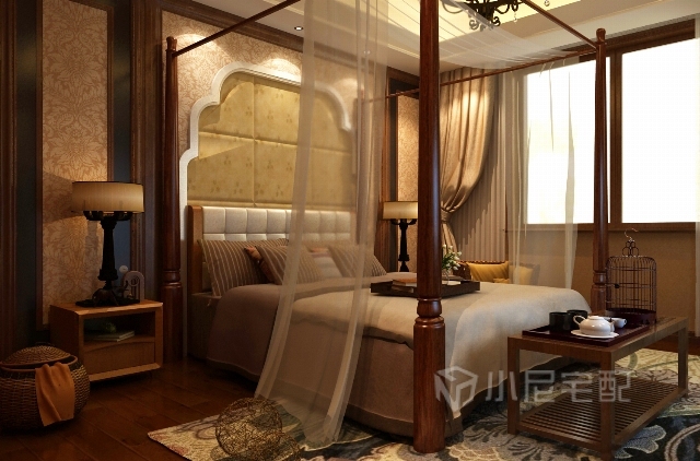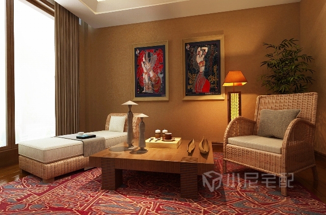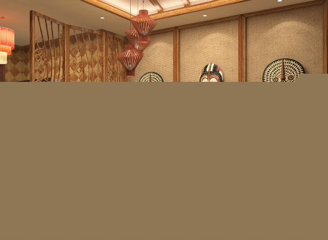 廣泛地運(yùn)用木材和其他的天然原材料,如藤條、竹子、石材、青銅和黃銅,深木色的家具,局部采用一些金色的壁紙、絲綢質(zhì)感的布料,燈光的變化體現(xiàn)了穩(wěn)重及豪華感。