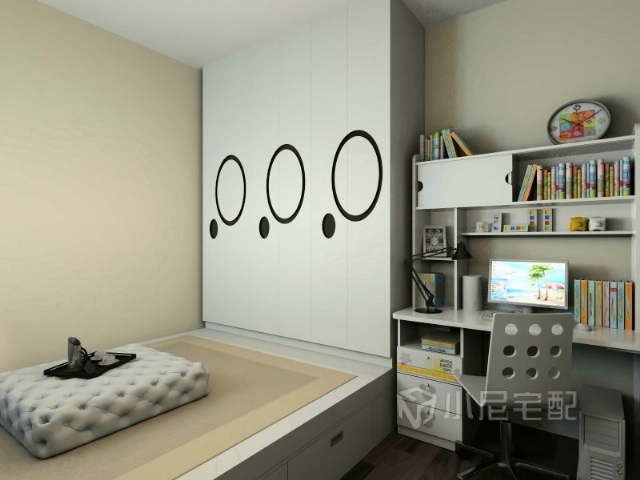 白色的榻榻米,簡單的造型,再加上書桌,是孩子居住的好場所。