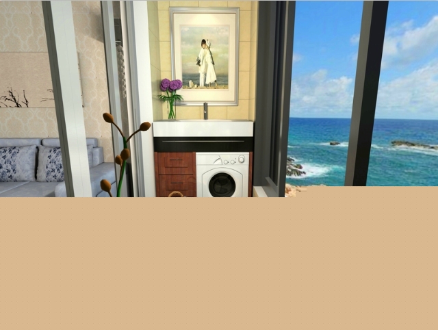 充滿了花香氣息,洗衣臺在那,靜靜等待中坐在板凳上望一望窗外