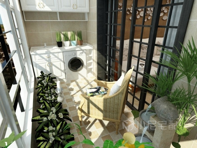 看又是很多植物,很了解主人特別喜愛植物,充滿了陽光燦爛照射在洗衣臺,等待中可以坐在椅子上看一看窗外,很方便又享受的