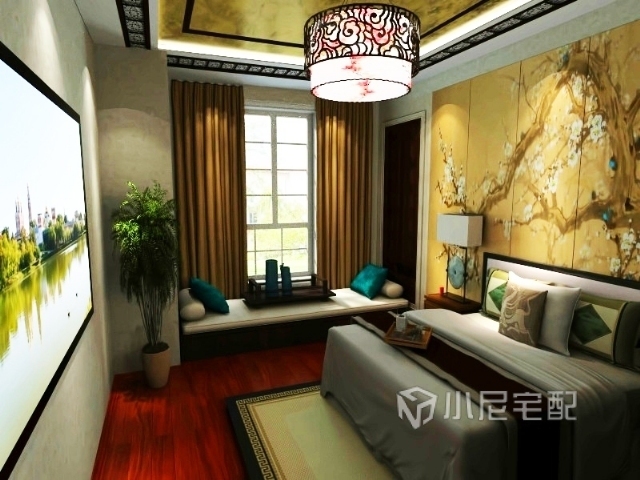 淺色系窗簾和深棕色的家具以及造型電視背景墻綜合搭配,把中式特點(diǎn)表現(xiàn)的淋漓盡致