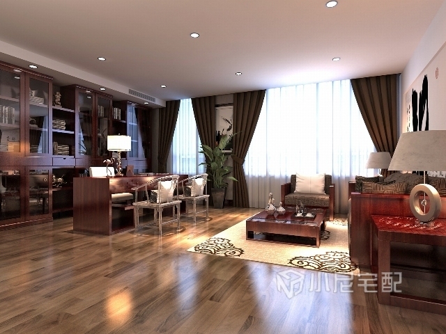 書房是學(xué)習(xí)工作的場所,純粹的中式風(fēng)格在書房中會是以中稍微有些壓抑的純木色,但在本方案中,以中式風(fēng)格為主的同時加入了現(xiàn)代的元素,在嚴(yán)肅的空間中帶著幾分的活潑?,F(xiàn)代風(fēng)格的座椅給沉悶的空間帶來一絲的不安于現(xiàn)狀,幾欲脫離出來,但這樣的結(jié)合也使得書房的嚴(yán)肅、安靜,擁有了一絲活躍。