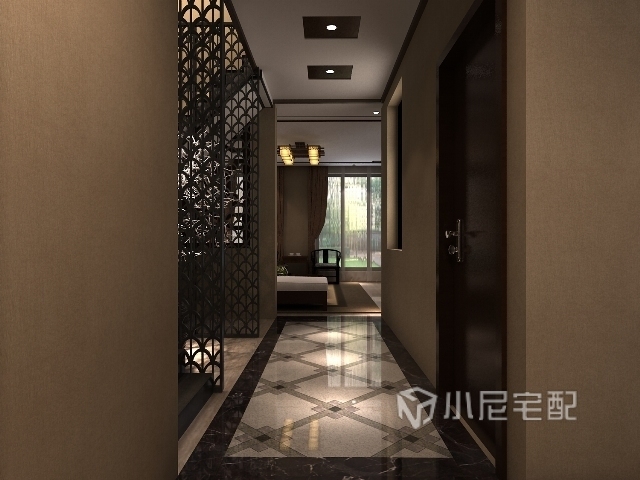 走廊是起連接空間作用的空間,本方案中,以現(xiàn)代的黑色材料制作出帶有古典風(fēng)味的隔斷,現(xiàn)代的裝飾品給空間帶來新鮮的感覺,兩者的結(jié)合給人帶來一種別樣的風(fēng)情。