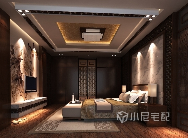 臥室秉承了傳統(tǒng)古典風(fēng)格的典雅和華貴,暗紅色的衣柜,木原色的床頭柜以及原木色的地板,還有電視背景墻以菊花來裝飾,徒增了高貴的氣息,整體顯示出的富貴、高雅。