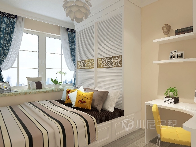 次臥采取榻榻米,同樣節(jié)省空間增加收納空間。