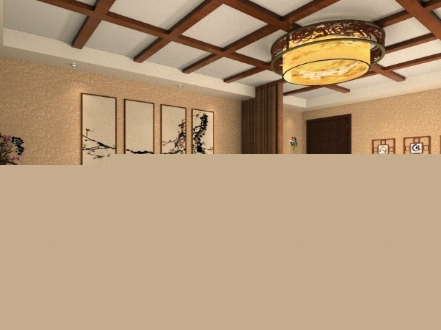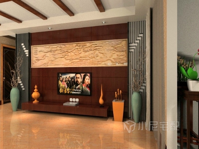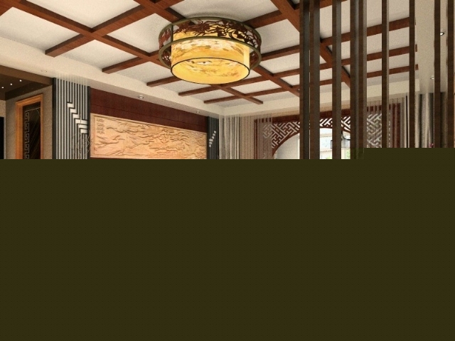 木質(zhì)橫梁與格柵的中國元素運用到吊頂,電視墻,以及隔斷
