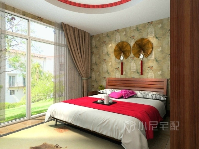 主臥家具采用中國胡桃顏色,能夠與壁紙更合理的搭配