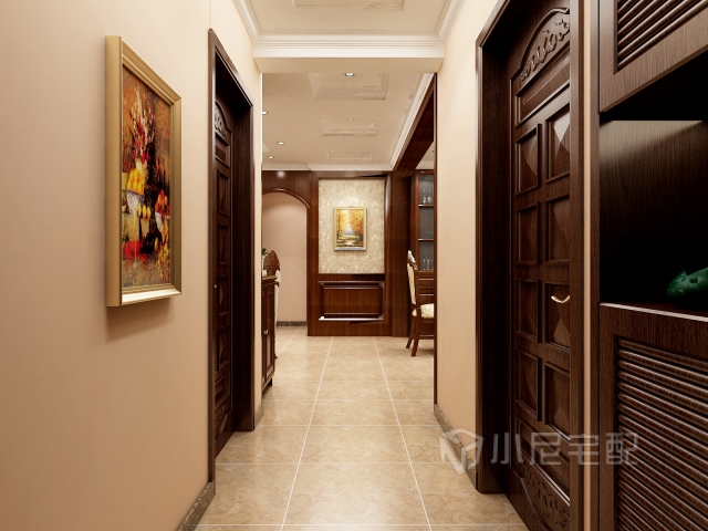 入戶走廊,以暗棕、土黃為主的自然色彩的主材和造型,而在走廊頂面則以若個正方格為造型吊頂。簡潔大方,舒適懷舊。