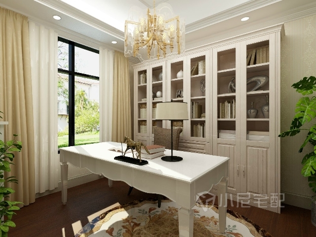 大氣的書柜,造型簡(jiǎn)潔的書桌,淡黃色的窗簾,綠植的搭配,打造一個(gè)讓人安靜專注的的書房