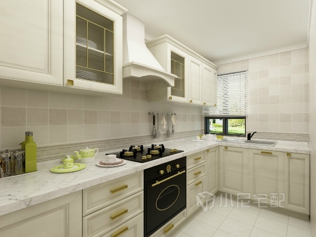 櫥柜造型簡(jiǎn)潔,功能齊全,搭配淡色墻磚地磚,顯得小空間更加寬敞明亮。
